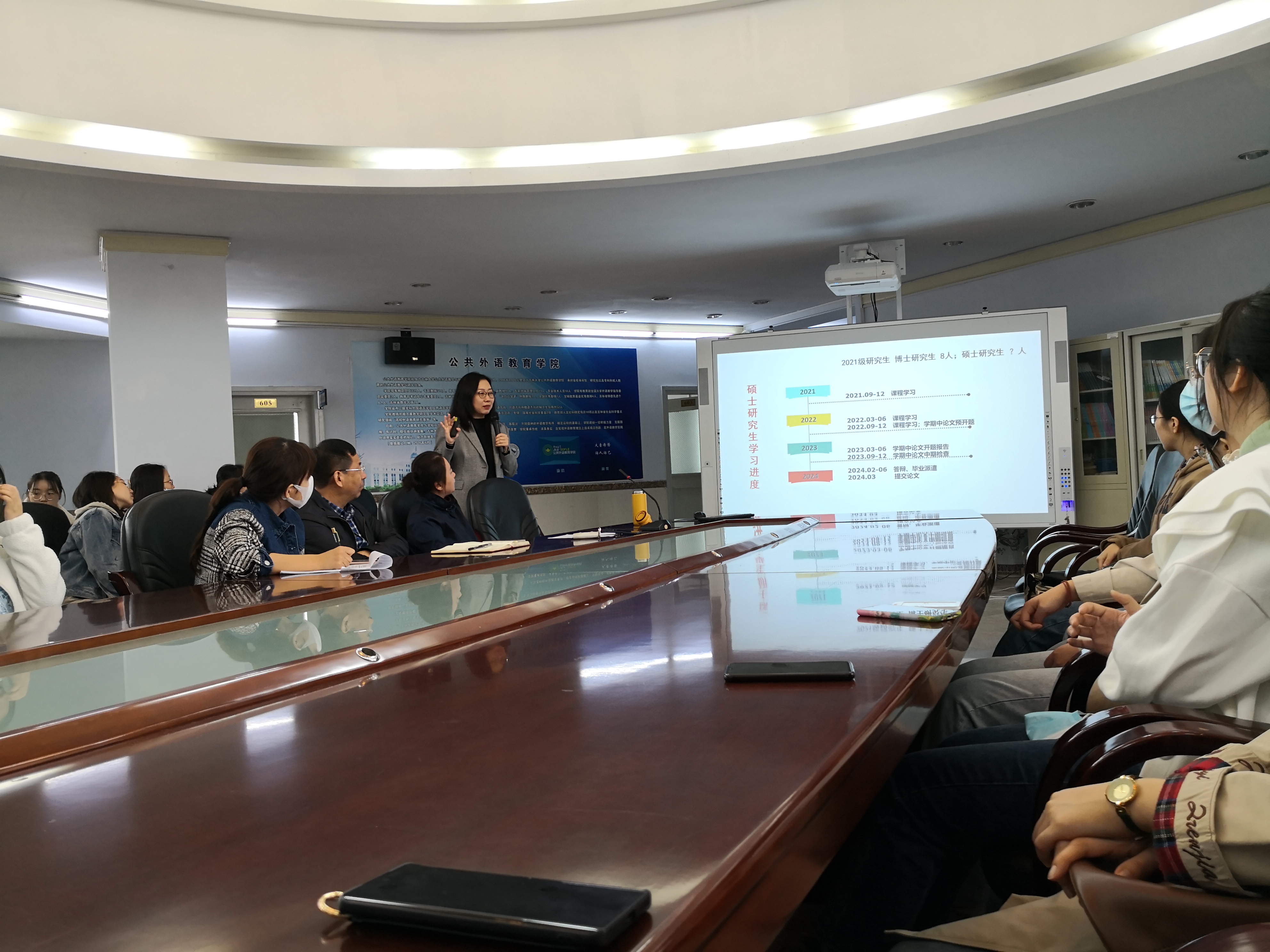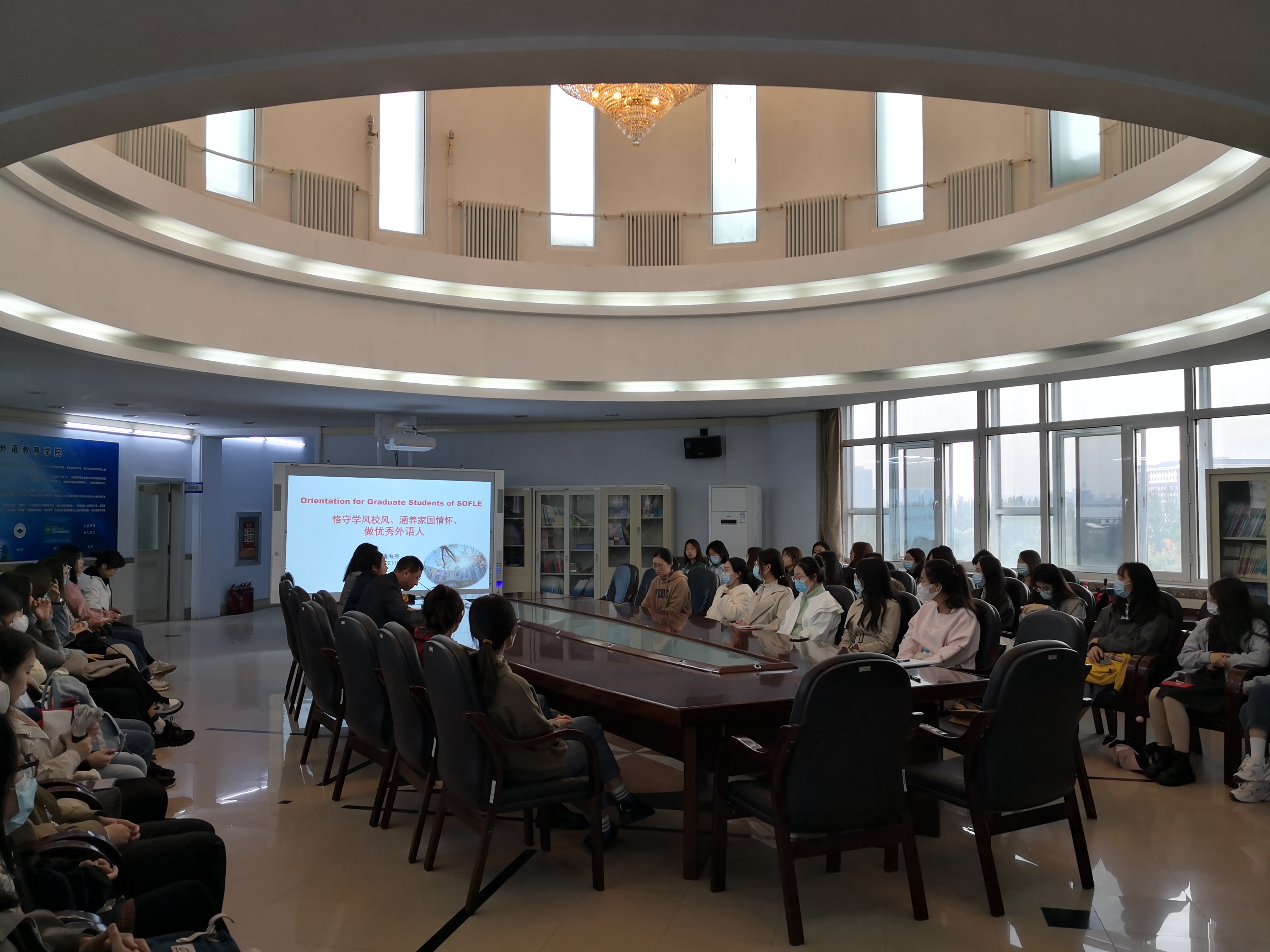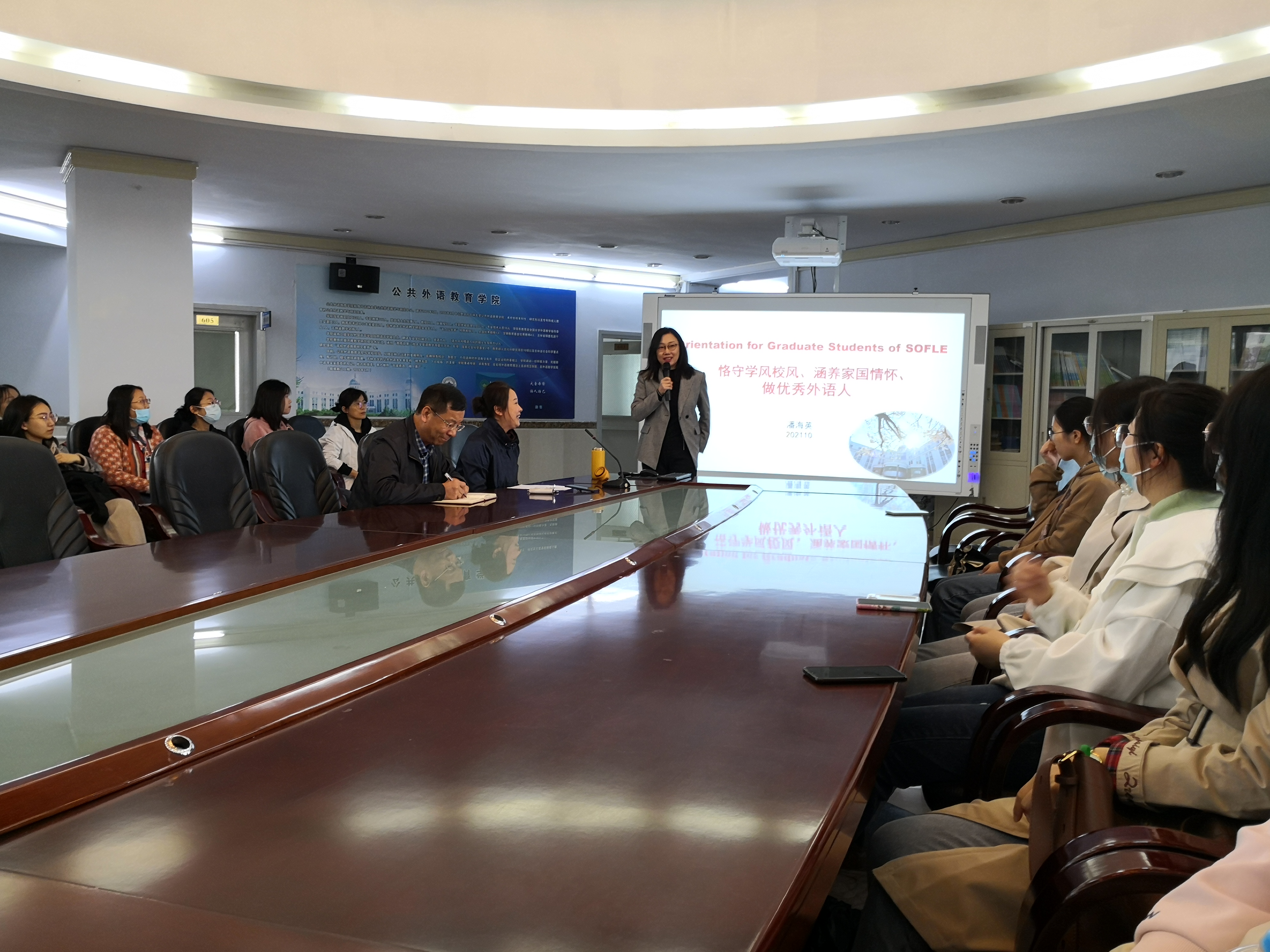 潘海英院长从人才培养、学科建设、科研成果、学科排名、国际合作和国际交流六个方面出发,详细解读了学院发展历程和学科建设情况,并强调了学校的精神传承;介绍了研究生的学习进度和科研方法并建议同学们应着重培养知识能力、科研能力和语言能力,努力做“厚通识、宽视野、多交叉”的多元化人才。潘院长鼓励同学们珍惜时光,不断增长自身能力,提高综合素质,用实际行动诠释“求实创新、励志图强”的吉大精神,争做优秀外语人。